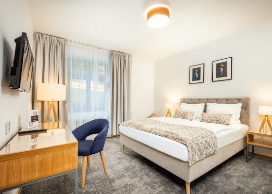 Pokoj je určen pro 2 osoby. Nabízí manželskou postel, antialergické polštáře v různých velikostech, šatní skříň, varný set, TV, vysoušeč vlasů, župany a pantofle.